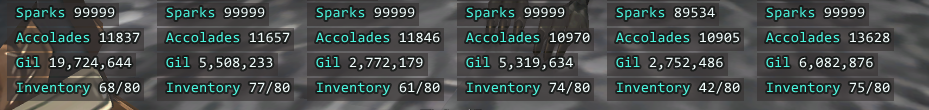 MultiboxInfo tracks and ipcs sparks accolades gil and inventory space across all chars load on everyone and have fun, will look best on 1920x1200