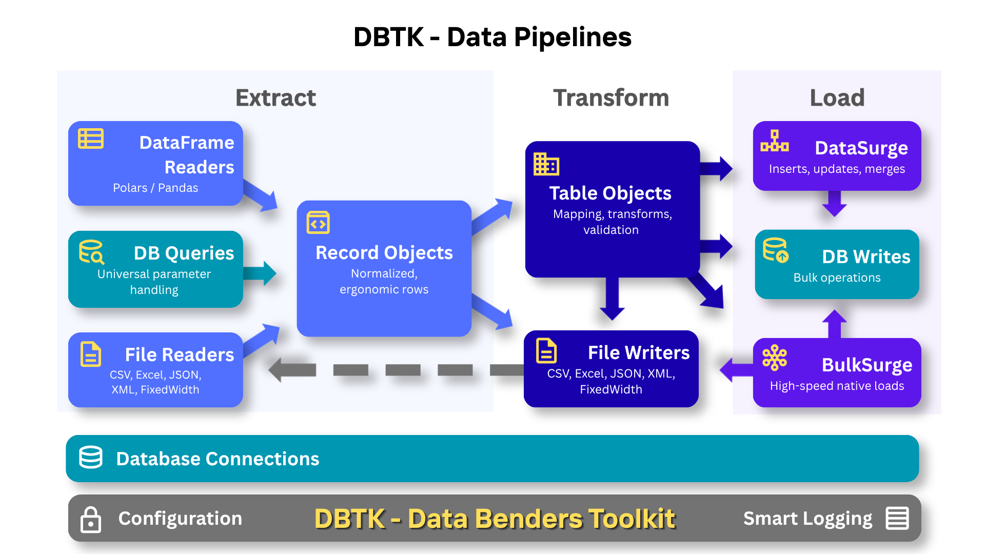 Design philosophy: Modern databases excel at aggregating and transforming data at scale. DBTK embraces this by focusing on what Python does well: flexible record-by-record transformations, connecting disparate systems, and orchestrating data movement.